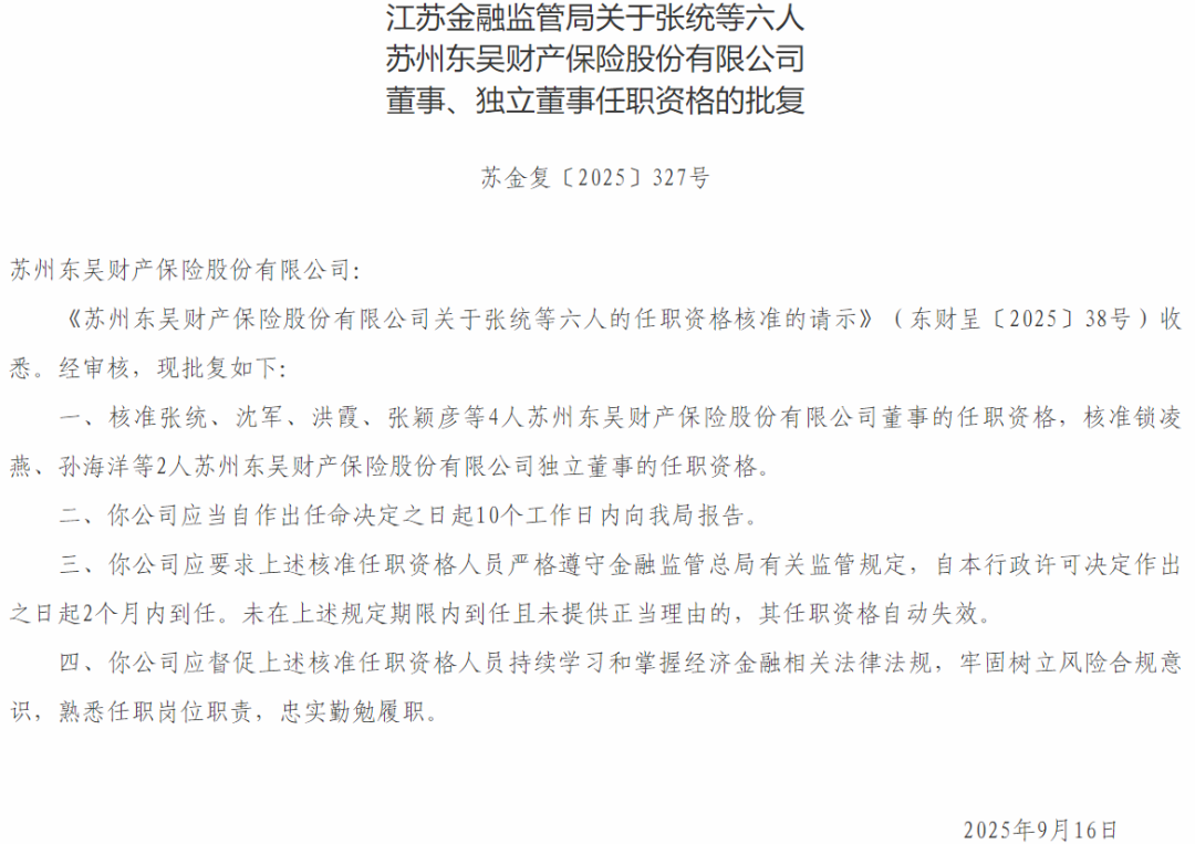 据江苏金融监管局官网行政许可信息,9月16日,江苏金融监管局核准张统、沈军、洪霞、张颖彦等4人苏州东吴财产保险股份有限公司董事的任职资格,核准锁凌燕、孙海洋等2人苏州东吴财产保险股份有限公司独立董事的任职资格。